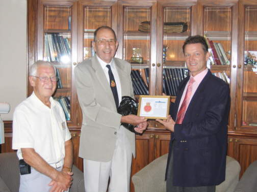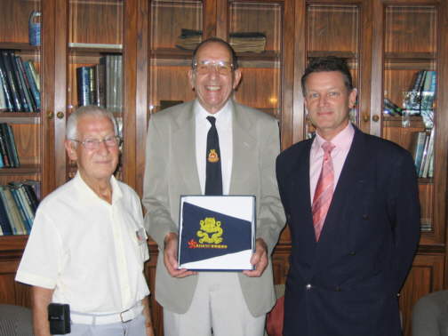 Eric Simons (left) with Reg Warner (centre) presenting a framed memento of the ship to Rene Verhulst (right), General Manager of the Royal Hong Kong Yacht Club.