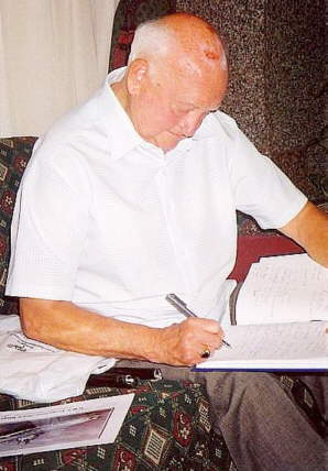 Harry Gee autographing the war veteran's signature book belonging to Eric Bonanno, during the Malta Veteran's Reunion Week - 2005. The photograph was taken at the Diplomat Hotel, Malta on 1st October 2005. A photograph of the aircraft carrier, HMS. Vengeance is in the foreground.