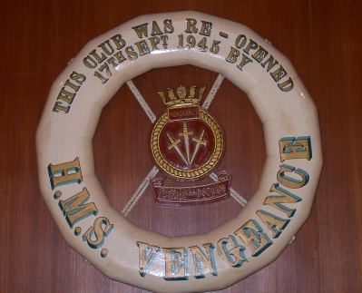 The ceremony was conducted by Commander-in-Chief Rear Admiral Harcourt in the presence of the Commodore D.H. Everett, Captain D.M. Neame, Commanding Officer HMS. Vengeance and a number of other Officers. To mark the opening, four dinghies took part in a race which was won by Commander Stokes, and a lifebelt from HMS. Vengeance was hung in the lounge bearing the inscription;