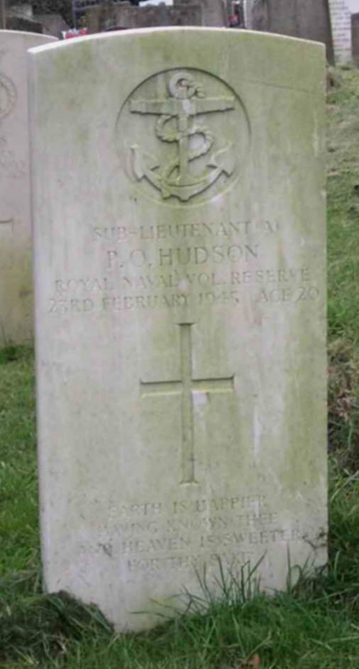 Son of John Howard Hudson and Lilian Alice Hudson of West Hampstead, London, England. Pilot with No.1850 R.N. Fighter Squadron. In Chance Vought FG-1D Corsair IV (KD 510) which failed to return to ship after dawn formation practice in Clyde Approaches, Scotland. The Commonwealth War Graves Commission Casualty No. 2428715. War Grave photo below. (Enlarged)
