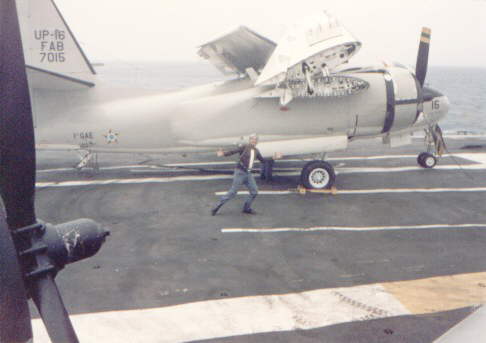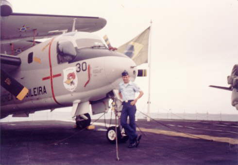 This photo shows the corrugated surface of the aft part of the flight deck. The rear flag pole is in situ. Note the heavy tie-down arrangement of the aircraft to the flight deck. Sergeant Luis Thiesen is pictured with the aircraft.