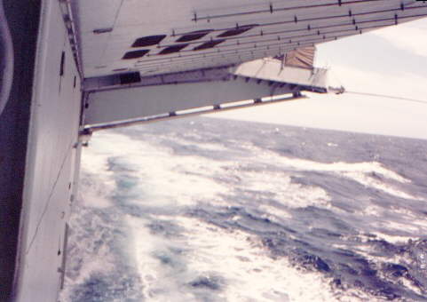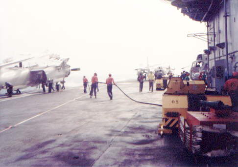 This shows the scratches on the deck surface made by the arresting wires joint. Note the wire lifting bar and the Landing Signal Officers wind shield lowered, indicating that the ship is not downwind yet.