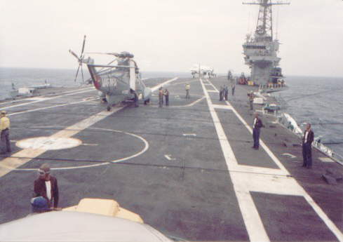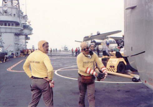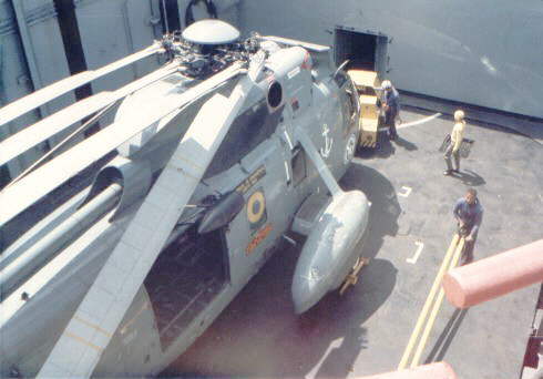 A SH-3 ASW helicopter on the forward lift in the lowered position. The open door facing it, is the aerial torpedoes magazine and maintenance shop. The long yellow bar being handled by the crew man is a tow bar.