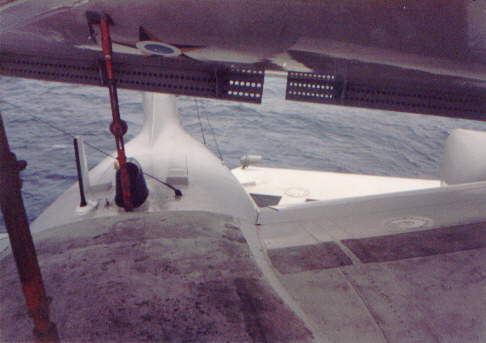 Under the angled flight deck extension, looking aft and showing the landing mirror sponson.