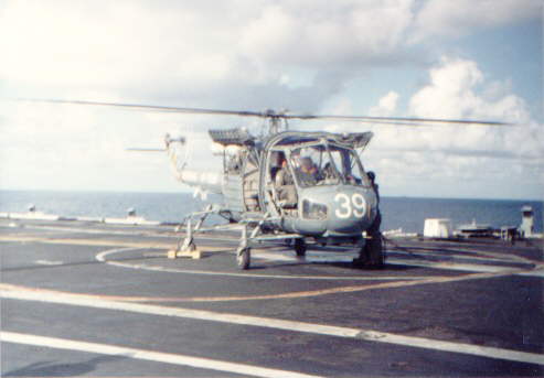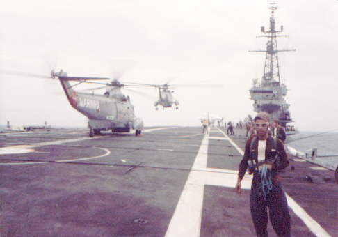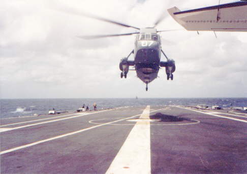A deck level shot of a SH-3 Brazilian Navy ASW helicopter squadron (HS1) coming to land.
