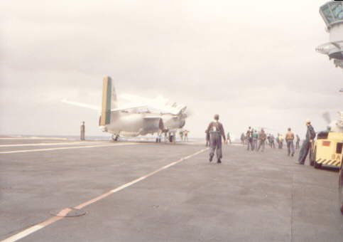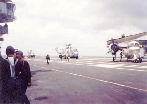 This is a wide view of the forward flight deck movements, while a P-16E is being readied to be catapulted off. Note the still running P-16 in front of the island, barely visible at the extreme right of the photo. There is also a helicopter being refuelled, hidden by the standing crewmen.