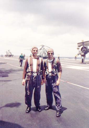 A relaxed moment on the flight deck (goggles and ears protection down). Sgt Schirmer (left) and Sgt Thiesen display all the elegance of the flight deck wardrobe.