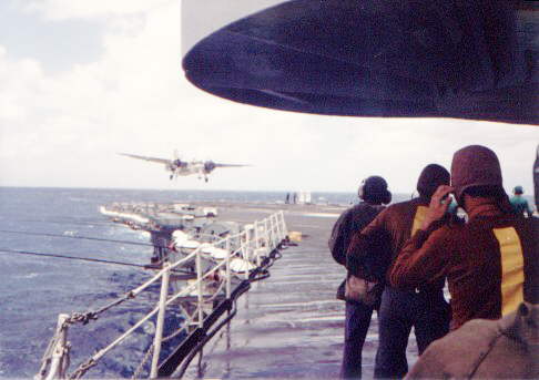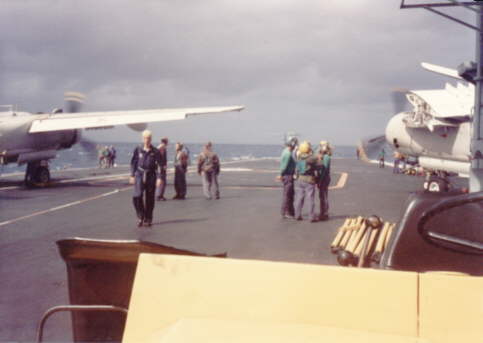Shows from the island, looking aft and the LSO's canvas wind breaker on the port side. The structure above the men is the island's big crane base. Note the motor boat stowed on the ship's side, below the flight deck, starboard side.