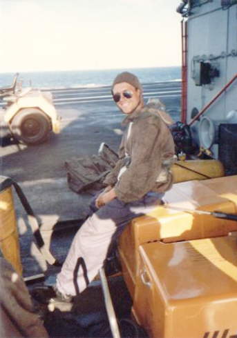Sgt. Theisen taken at the island's rear area. The yellow equipment was used for washing the navy helicopters of the salty layer left after flying above the sea. The BAF planes were not washed in this way. Fire equipment was stowed on the deck at my right hand side and at my back you can see a foam pipe, painted green.