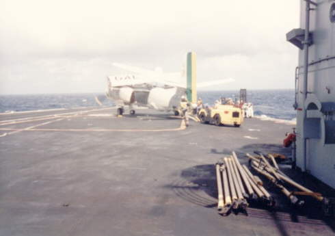 A 7035 about to be bridled to the catapult (left). The yellow plate in the foreground is a towing tractor note it's control levers, camouflaged against the yellow towing bars on the flight deck.