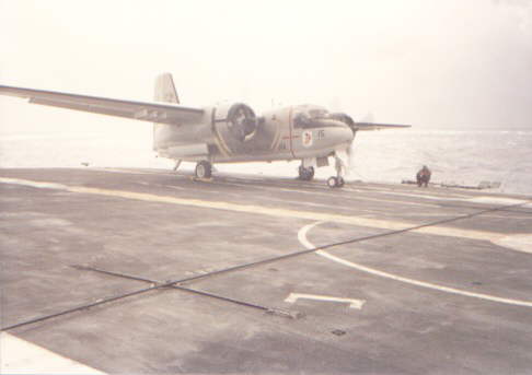 A P-16E being readied, it is still chocked to be towed backwards, engines running, toward the island's front area, possibly to clear the deck to allow another plane to be lowered to the hangar deck. Here we see the operational floor of the centreline lifts on aircraft carriers. The web like shadow on the deck was cast by a passageway around the ship's C.O.'s place on the bridge. There are spare towing bars on the deck, as is the crash crew. Note the pitching and rolling.