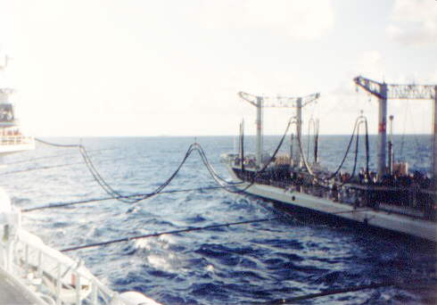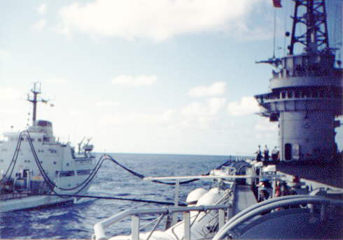 The oiler 'Marajó' refuelling the 'Minas Gerais'. Note the refuelling party wearing orange life preservers, under the island's crane, top left of photo.
