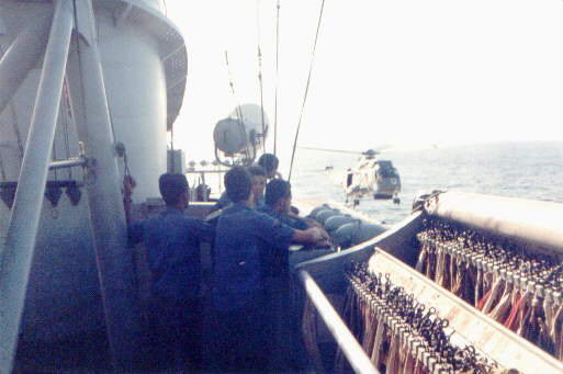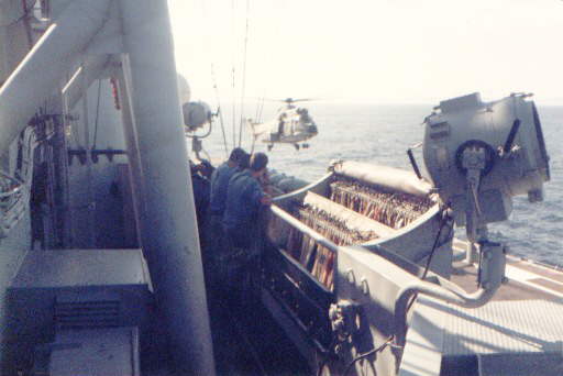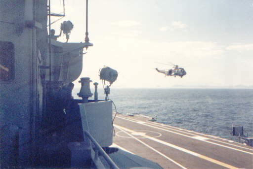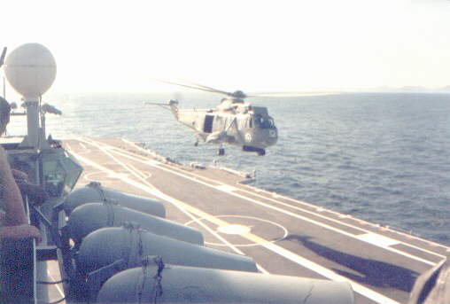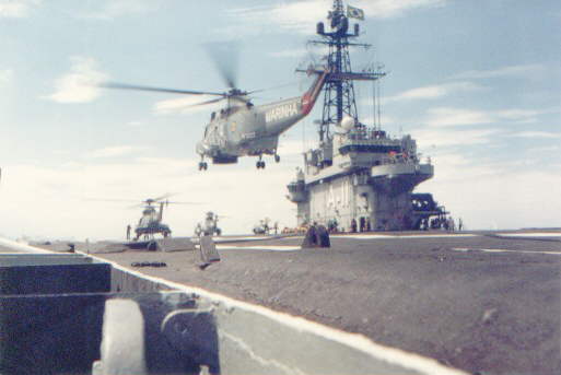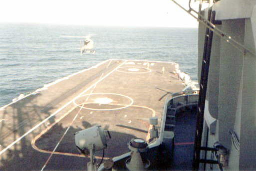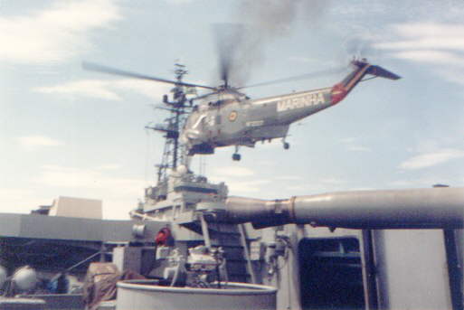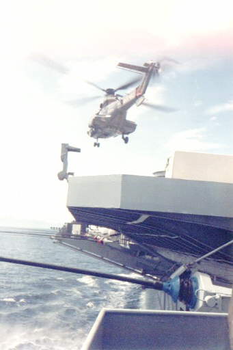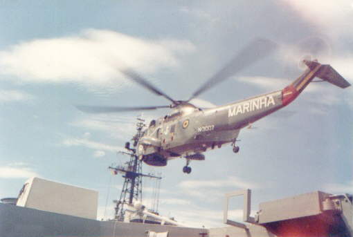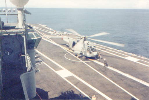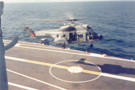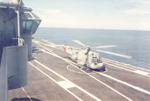 A Brazilian Navy's Super Puma lands on Minas Gerais. Note the retracted landing mirror in the distance of the flight deck from the camera.