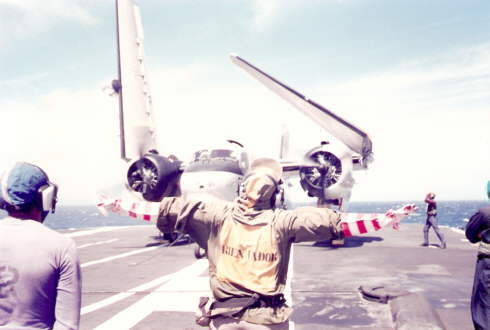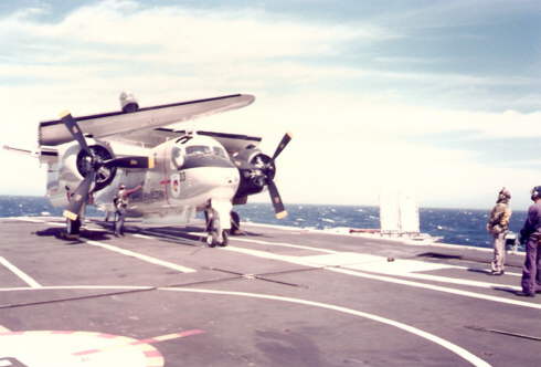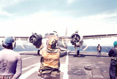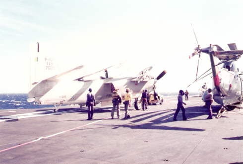 After the air boss check for loose things on deck, fire extinguisher, propellers clearance, goggles and ear protection applied, from the control tower - directed by the navy personnel, the aircraft has its engines started (see the 115 VAC cable pending from the plane's belly. After being released by the mechanic, it was reeled and stowed by a sailor wearing blue shirt barely seen behind the plane's left main landing gear). Note the plane has its torpedo bay doors open and the deck's corrugated surface by the yellow strip.