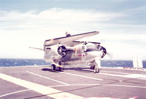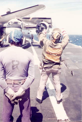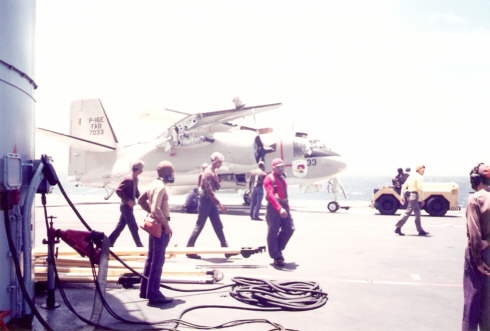 The "33" after the crew had boarded the plane. The mechanic has the access stair stowed on the plane's main access door and gives an OK to the Navy personnel. Note the LSO's wind shield and the corrugated surface of the deck noticeable by the deck white stripes trim.