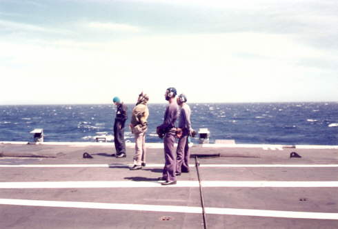 The waiting LSO, the 'orientator' and the two blue shirt guys in charge of taking the chocks and tie downs chains off before take off.