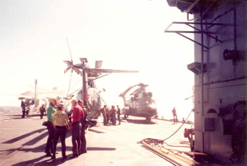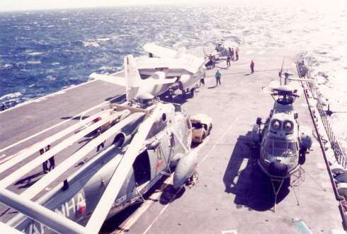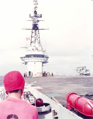 Photo from the island shows the aircraft arrangement and tie-downs on the helicopters. You can also see the catwalk with refuelling hoses heels at each end of it. Beyond the upper heel, there was no catwalk at all, just a frame sustaining a safety net preventing the 'man overboard'. Note the painted squares in different colours at the very edge of the deck, indicating the catwalk's gadgets purpose.