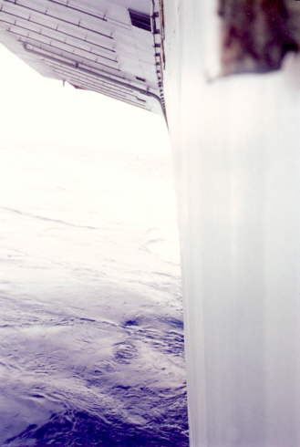 Photo taken from the 1st GAE's spares depot porthole looking aft on the starboard side and shows the huge overhang of the flight deck and the propellers wake when the ship was slow moving.