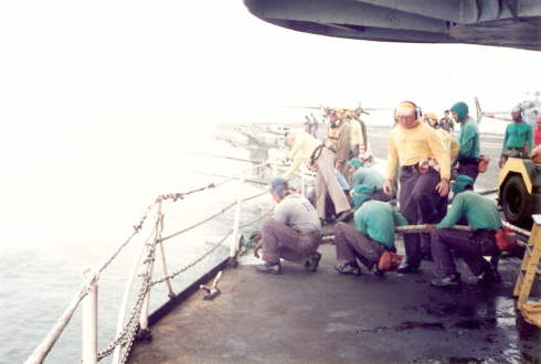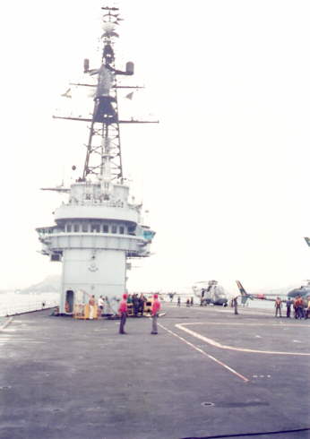 Minas Gerais flight deck looking aft from the starboard side. The various crew's can be seen at work.