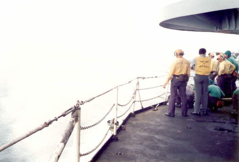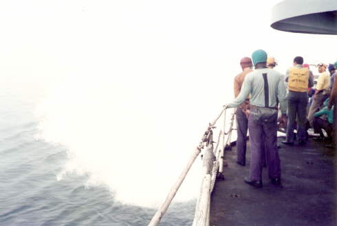 This photo shows the crew performing foam lines check, after the ship left Guanabara Bay for an aviation safety evaluation of fire equipment. Photo taken from starboard side, looking aft, beneath the rear pom-pom gun mount.