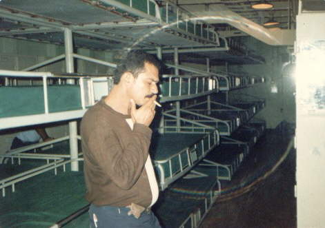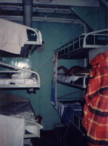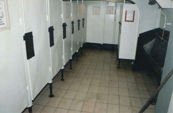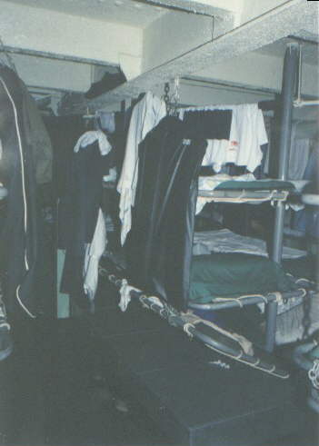 The aviation crews quarters on the gallery deck, below the angled flight deck. This photo shows the right hand, limit of the center space, looking forward.
