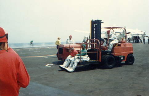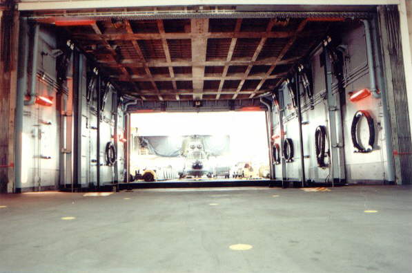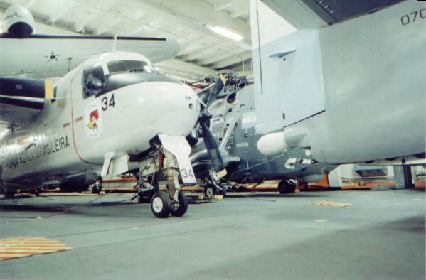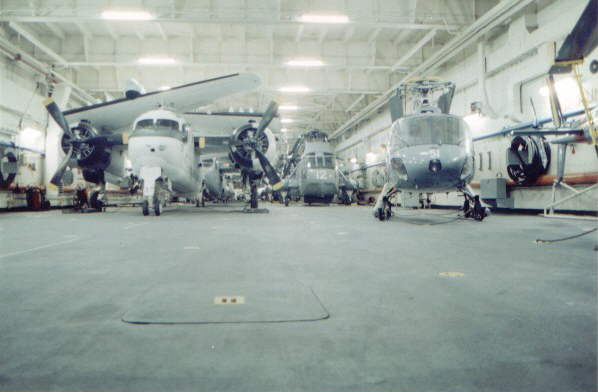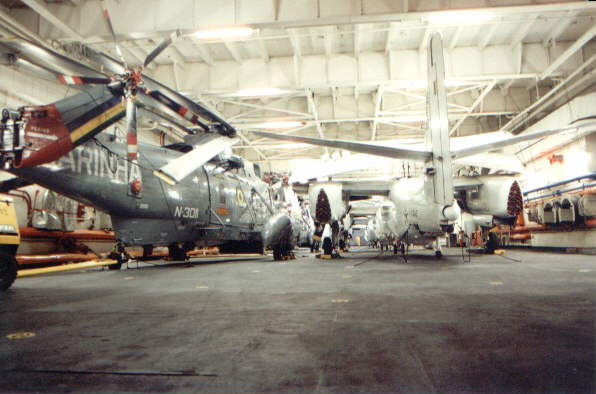 Hangar deck, looking forward shows the parked aircraft and helicopters. The third plane, the darker one (forward right side) is of the Argentine Navy. These photo's were taken in late November 1995.