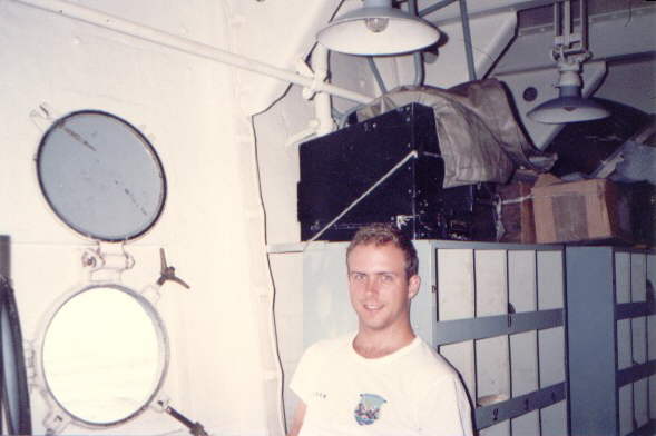 Sgt. Luis Thiesen in the air armament workshop, with a long table for maintenance work for machine guns and places for spare parts on the bulkheads. Photo taken looking aft, starboard side.