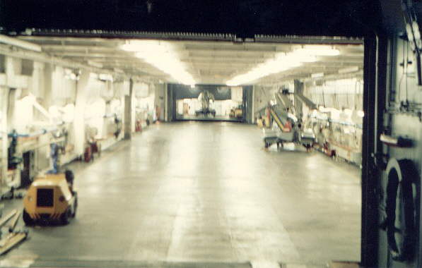 Hangar deck heavy repair shop and the 'aft' lift, looking aft.
