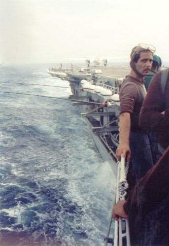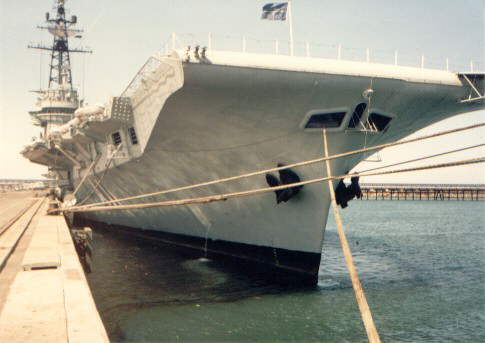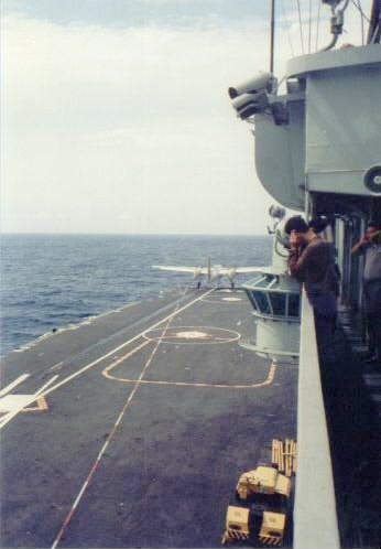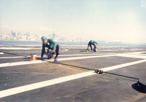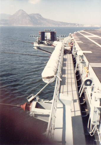 This photo initiates a series taken between 14th August to 22nd August 1989 and shows the arresting crew members getting the arrester wires grease soaked. The ship was leaving the pier and heading for the mouth of the Guanabara Bay en-route to Santos City harbour.