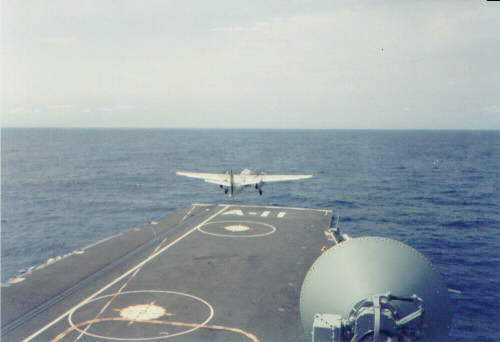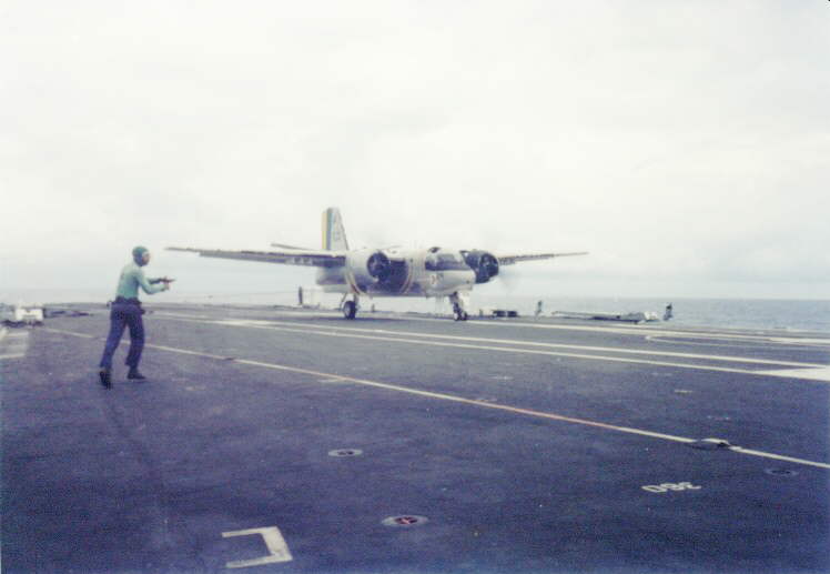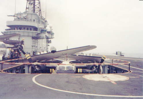 The UP-16A 7024 landing. At both sides on the flight deck, the emergency barrier poles (painted white) are laying flat. They are placed in added sponsons that were not installed in the reconstruction process in the Netherlands, the poles and the barrier storage (in cases aft of the masts) were located closer to the landing area. You can also see the number "380" painted in the deck, it stands for the length, in feet, of the flight deck, the little holes with welded crosses are for tie down purposes. The running sailor is signalling to the orientator to remind the pilot to retract the tail hook.