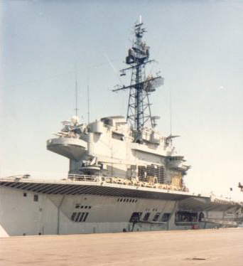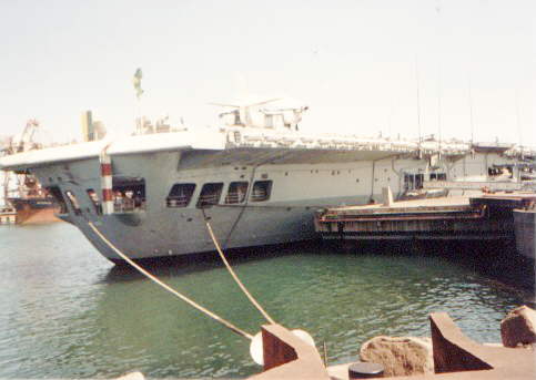 The island, starboard side looking forward. Although not clear by the sun glare, the lifting crane stowed and the black tubes I believe, were used in fuel transfer. Forward of it the yellow towing bars tied to the island's side too. Alongside it were the towing tractors. On the inclined side hull aft, above ventilation openings, there is the sole port-hole of the 'famous' briefing room No. 2.
