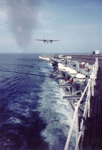 This shows a good view of the ship's stern, boat stowage and the emergency barrier pole, laying flat on the flight deck.