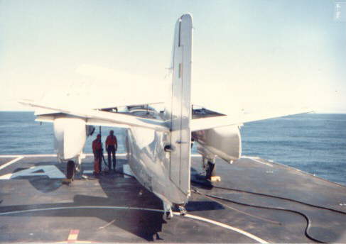 A Brazilian Air Force UP-16A, a conversion from a P-16a (S-2A) for COD and training purposes been refuelled at the bow of the ship. Note the pennant number painted on the deck and the tie-down chains at the fuselage sides and inner sides of the main wheels.