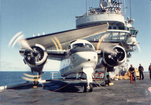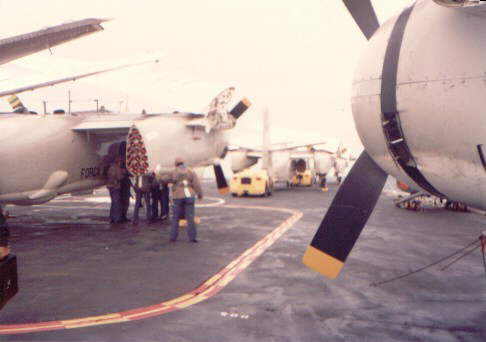 Another UP-16A (7015) making a 'turn up' for maintenance purposes. Note the different painting patterns on the props. The ship has it's forward quad 40mm. anti-aircraft gun with fire director radar dish antenna at the Task Force bridge level, above of the ships bridge.