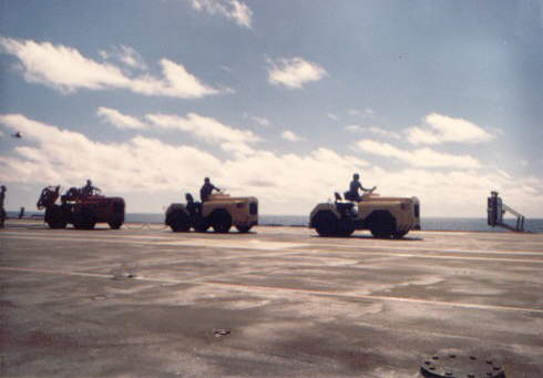Brazilian Air Force P-16E (S-2E) is on the forward lift ready to be lowered into the hangar deck. Two UP-16A's (converted S-2A's) are connected to towing tractors, ready to be towed onto the lift and stowed in the hangar deck. Note the 'tie down chains' on the aircraft right.
