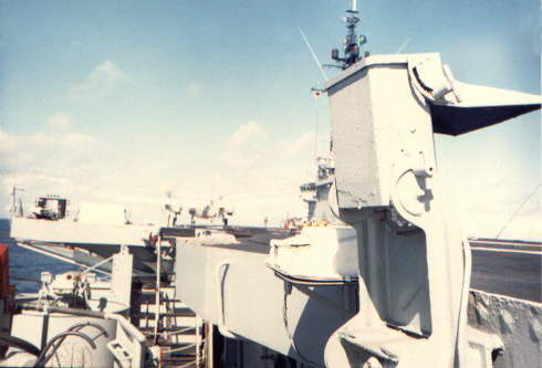 The structure above the deck is one of four light sources intended for marking the limits of the arresting zone to the pilots in night landings, the white cover at left is one of the flight deck speaker systems. The red piece at the extreme left is the twin 40mm block cover and the sight of the mount guarded by two curved bars. Beyond that is the optical fire director and a stairway to the flight deck.