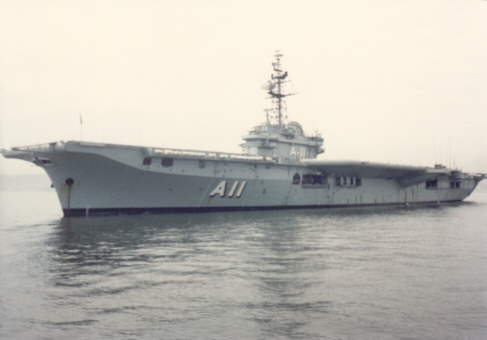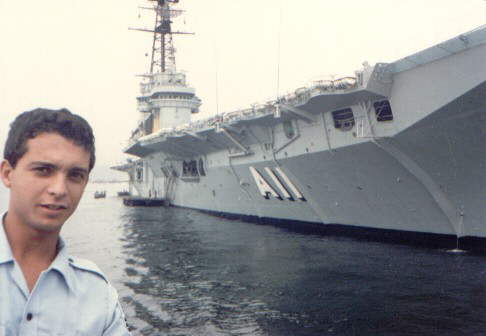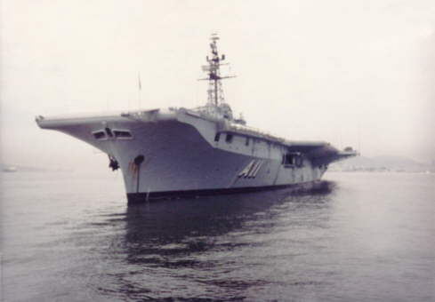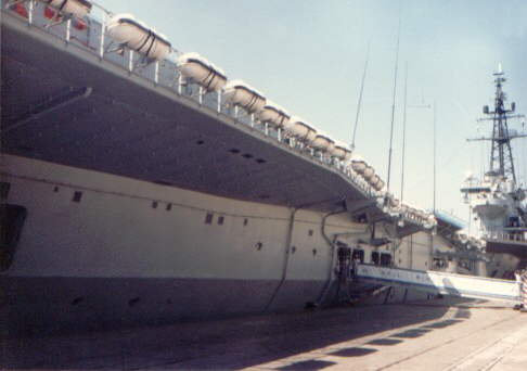 Minas Gerais at Santos City harbour. Note the coke bottle 'waist' shape of the flight deck given the 8.5 degree angled landing strip.