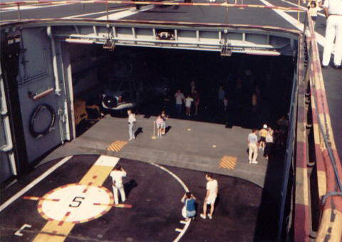 A view of the aft lift, lowered for an opening day. The red and yellow marking on the grey hangar deck flooring, secures the retractable fire curtain within the hangar deck.