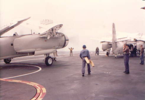 An incoming aircraft is moved forward off the front lift (red and yellow markings, bottom left hand corner of photo). A sailor moves towards the aircraft with chock for the wheels.
