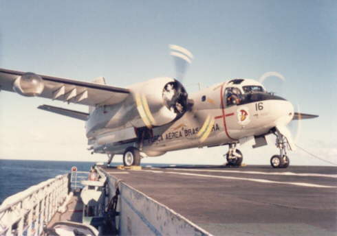 An Brazilian Air Force (Força Aérea Brasileira) P-16A 7016 prepares for take-off. The stowed flag pole lying along the catwalk edge (this was assembled while in port) was fitted to the aft of the ship and the red dome light, marked the outline of the flight deck at night. This aircraft today is preserved in its original splendour at the Brazilian Air Force's Museum.