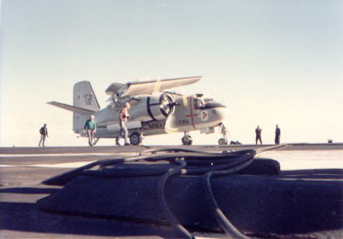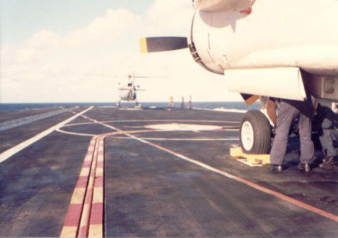Shows the catwalk, starboard side, looking aft, just before the island, which is obscured by the parked P-16. The fuel reel hoses are identified by the colour squares painted on the flight deck: Orange to Av Gas, Blue to jet fuel - Kerosene.