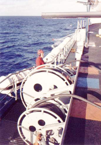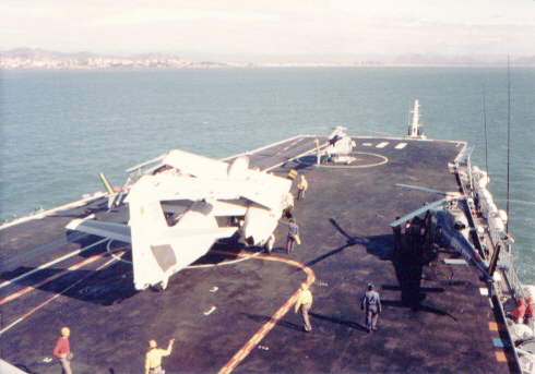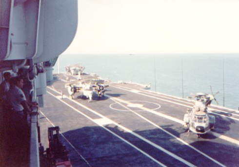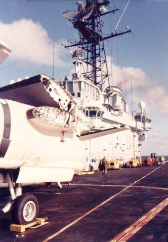 Another view of the flight deck, with the radio antennae raised at the decks edge. The aft flag pole is in position as the ship prepares to enter harbour.