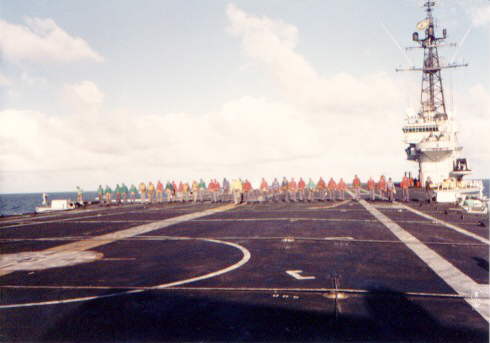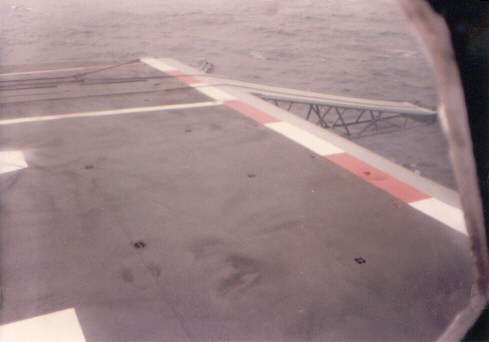 Photo shows the bow of the ship and catapult cables. The black markings on the flight deck are tie-down points for aircraft or helicopters.