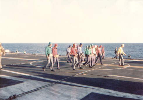 Another view of the catwalk, starboard side with two ratings dressed in red, bottom right corner of the photo. The fuel markings (Orange and Blue) can be seen on the flight deck. The white mast ahead of the ship is from a harbours tug, towing the ship into Vitória City. (Victory, not the ancient Queen).