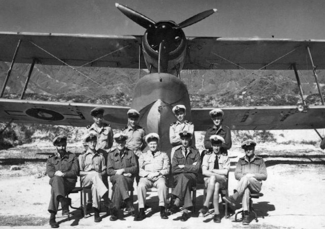 Officer's of the Air Engineering Department, Kai-Tak Airfield, December 1945. Back Row (L to R) Berrie, Ellcock, Green, Brant. Front Row (L to R) Kaplan, Hardey, Lt.(RN) Senior Engineer Tuck, Lt.Cdr. RNVR - Air Engineering Officer Mitchell, Spindler, English, Hanlon.