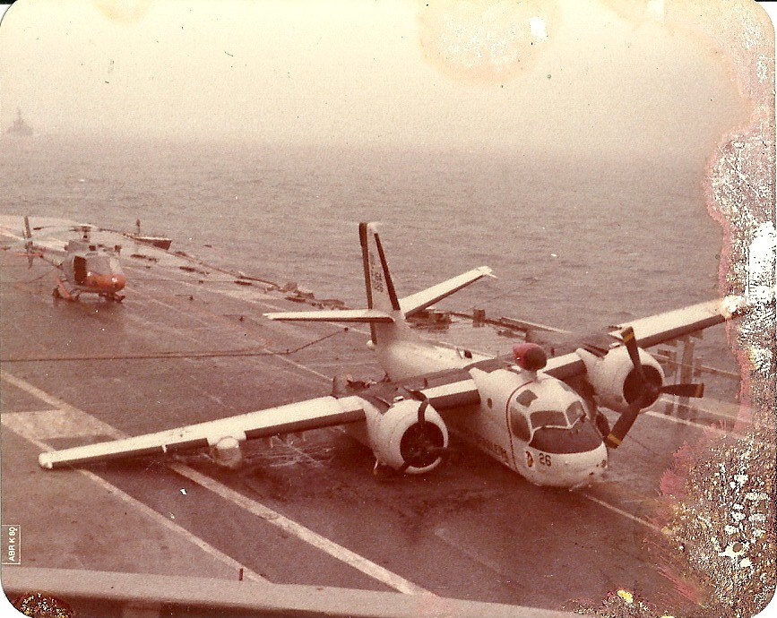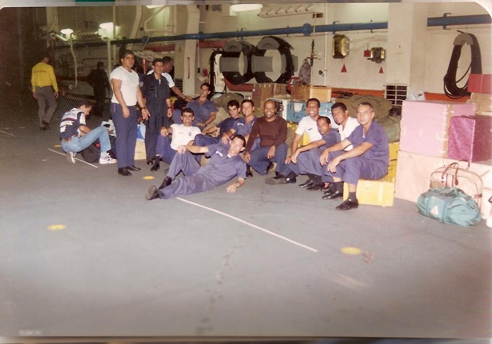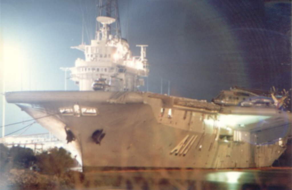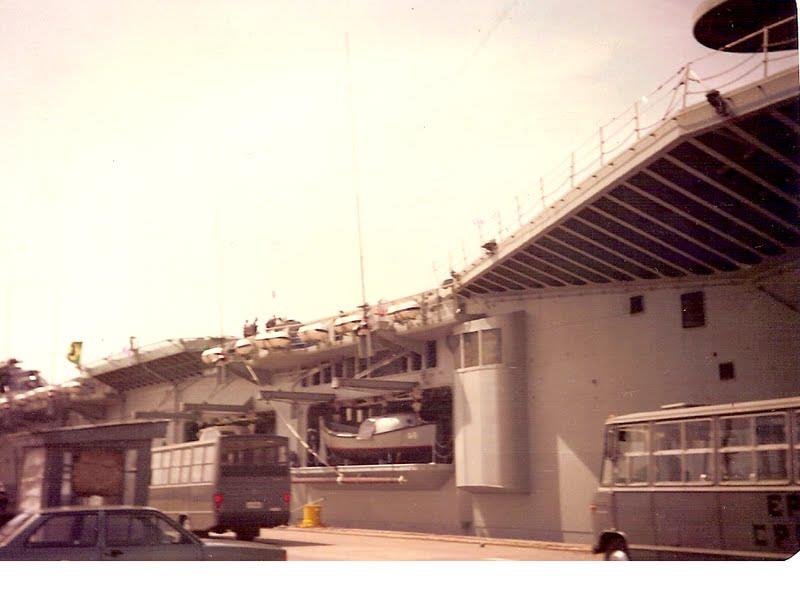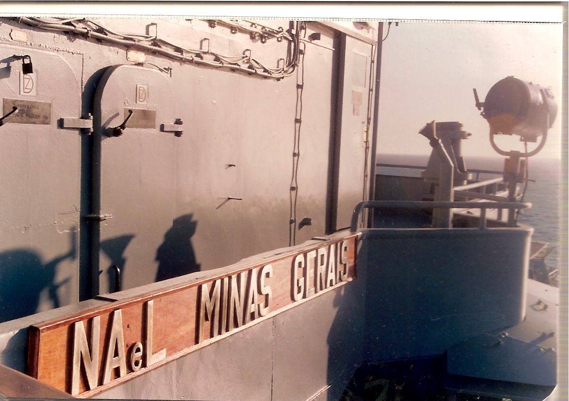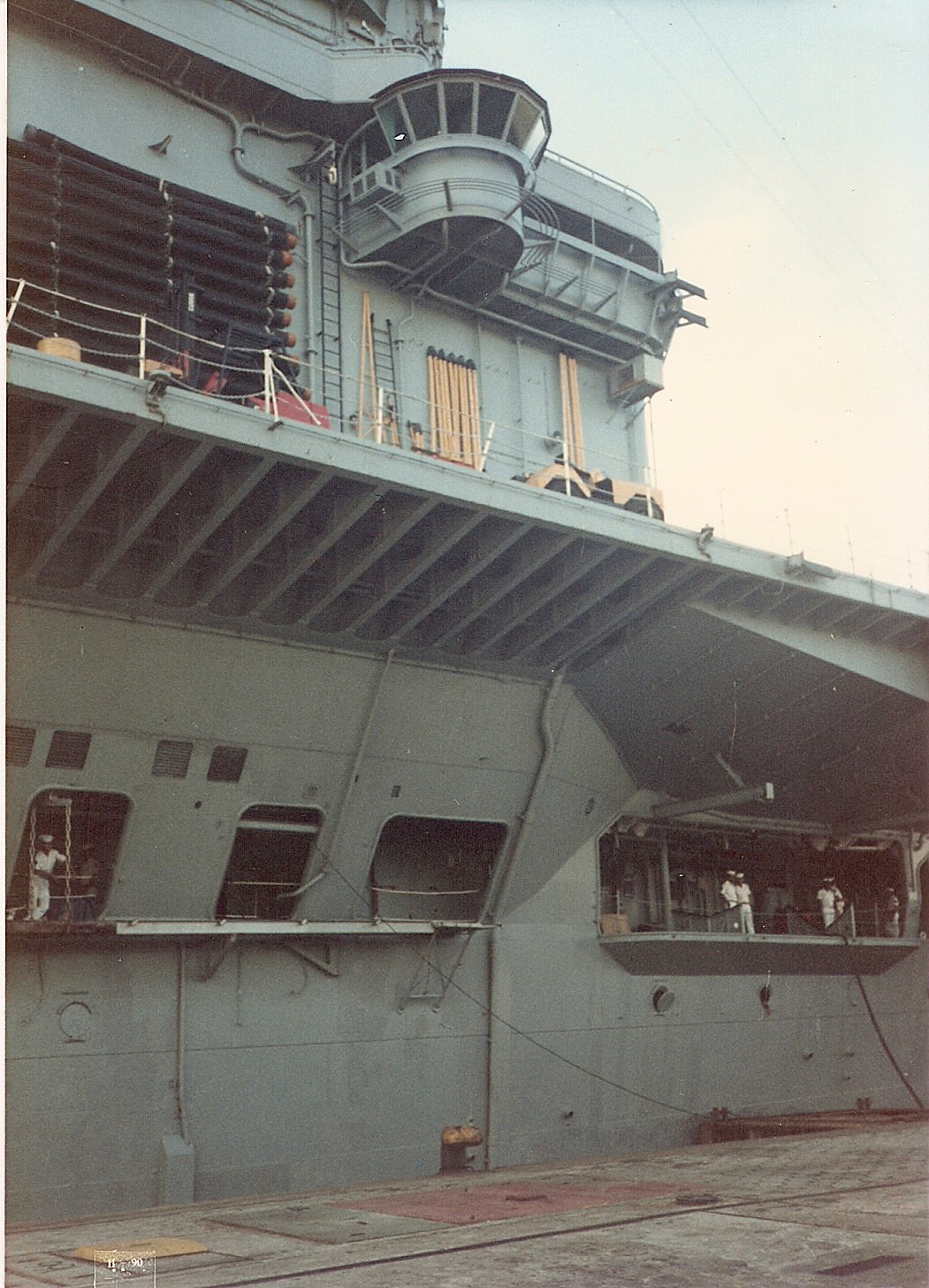 Starboard side of Minas Gerais in Port at Salvador City harbour, between 8th and 24th January 1990.