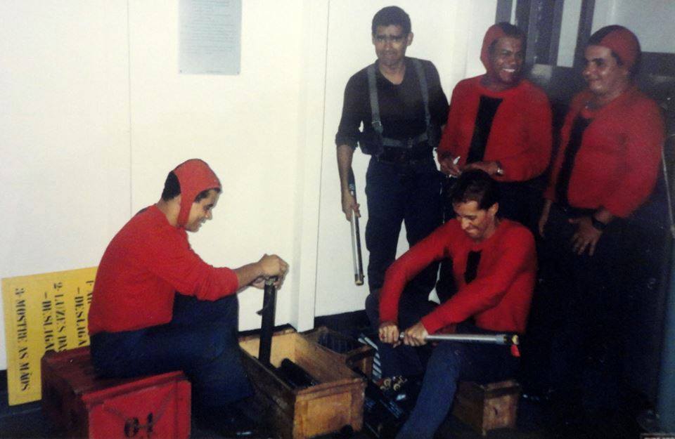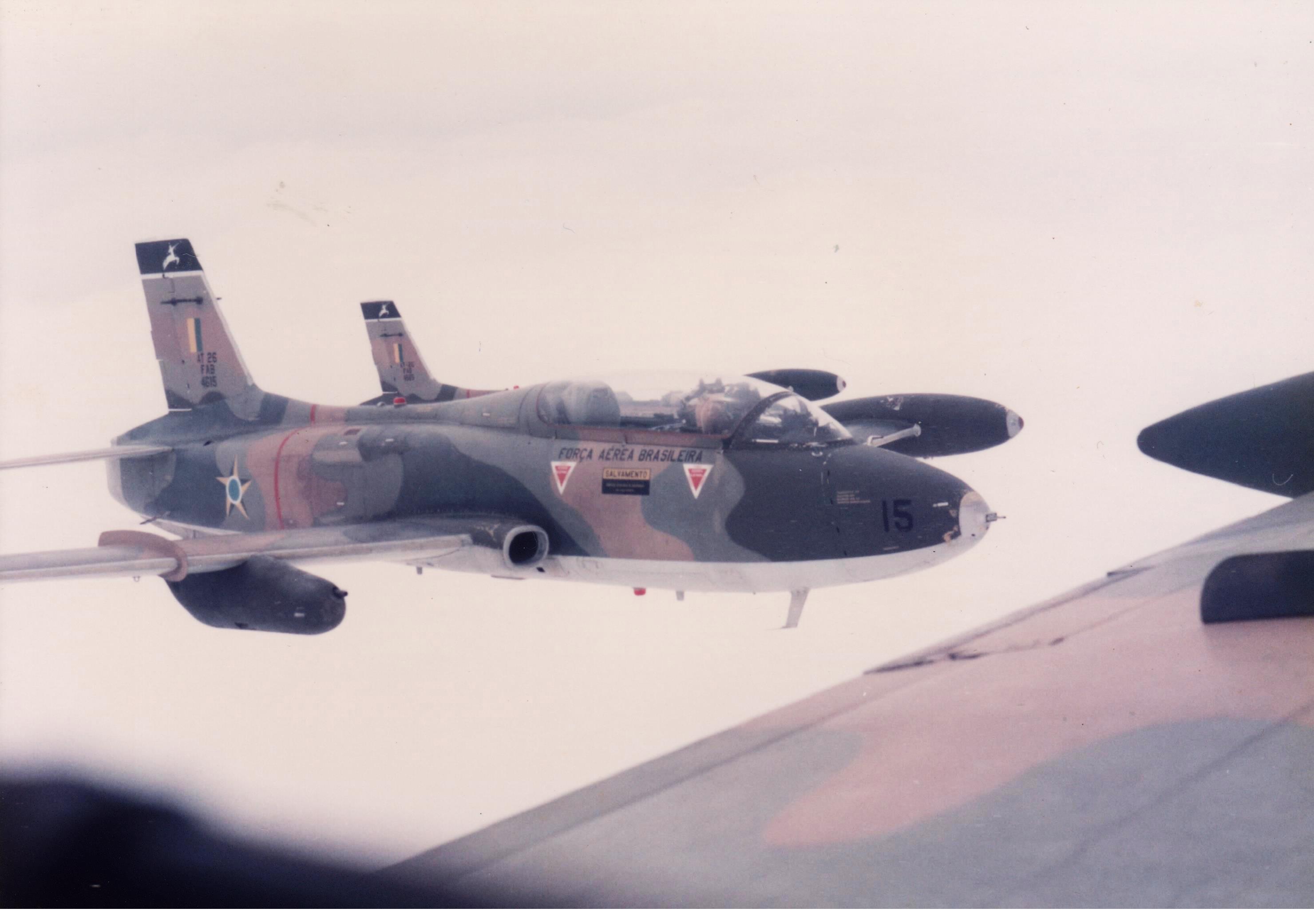 Some of 1ō GAE's Ordnance Branch, preparing 37mm. rockets for the armament magazines. Left to Right: Sgt. J. Cruz, Cpl. Cruz (brown shirt), Sgt. Luiz Fernando (seated), Sgt.Cantoário and Sgt. Souza.