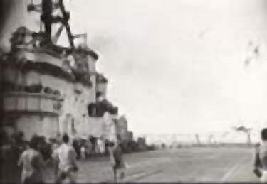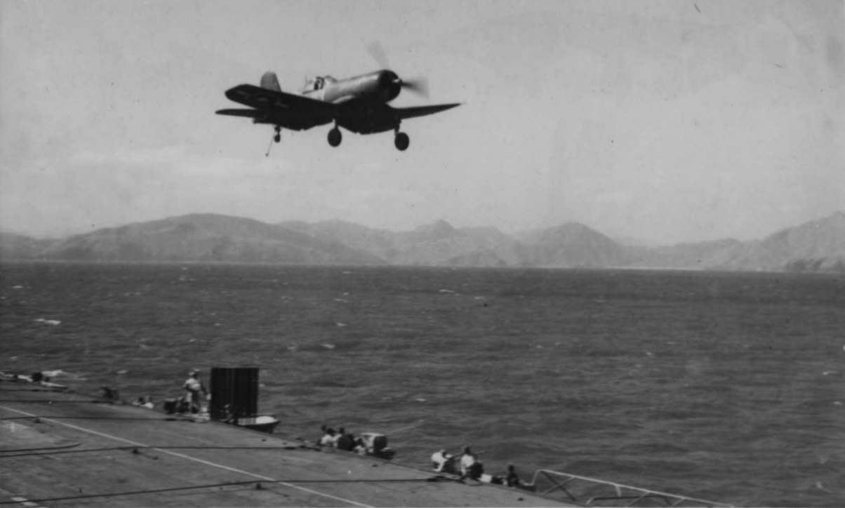 A Corsair of 1850 Squadron, above HMS. Vengeance 'goes around' after being waved off, near the Chinese Coast in 1945.