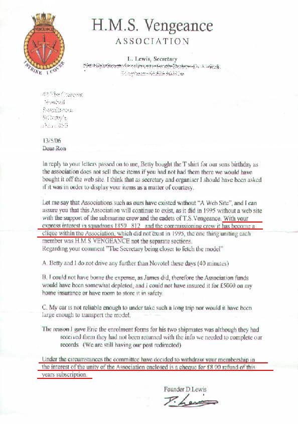 It appears that the Committee are resisting all efforts to give me a fair hearing at the 2007 A.G.M. by suspending me. They could also appear to be very embarrassed in front of the ship's company from the submarine and the T.S. Vengeance contingent, with such petty, frivolous, incorrect and contradictory charges.