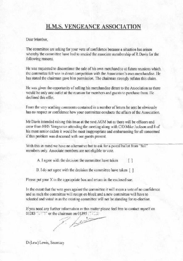 I have also requested a copy of the H.M.S. Vengeance Association Rules & Regulations, but have been advised by the Chairman that this manual does not exist. Therefore, as nothing is set down in writing, can the Committee can just make snap decisions without consulting or advising the membership?